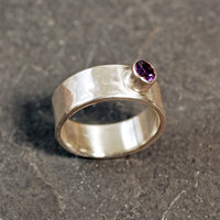 Add a little bling to your finger with this sparkly 4mm natural dark purple Amethyst. It is set in a sterling silver tube which has been soldered to a hammered sterling silver band.The band has rounded and smoothed edges for comfort, and was made using 16 gauge silver (1.29mm). Amethyst is one of February's birth stones.