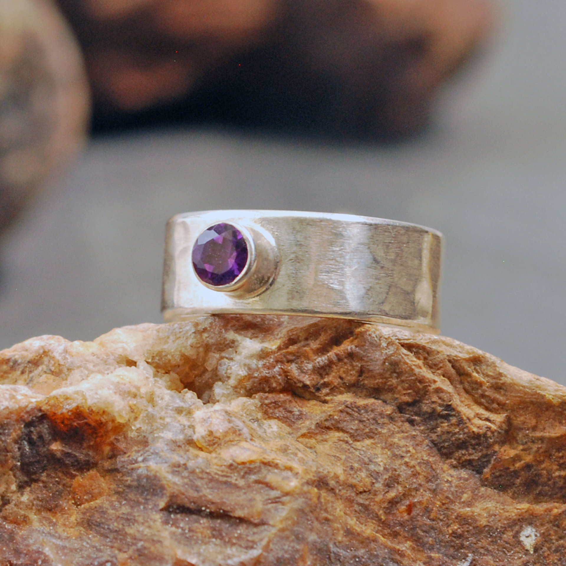SIZE: This ring is a US size 5 1/2. The band is about 8mm wide. The faceted Amethyst is 4mm. A similar ring can be made in other sizes on request.