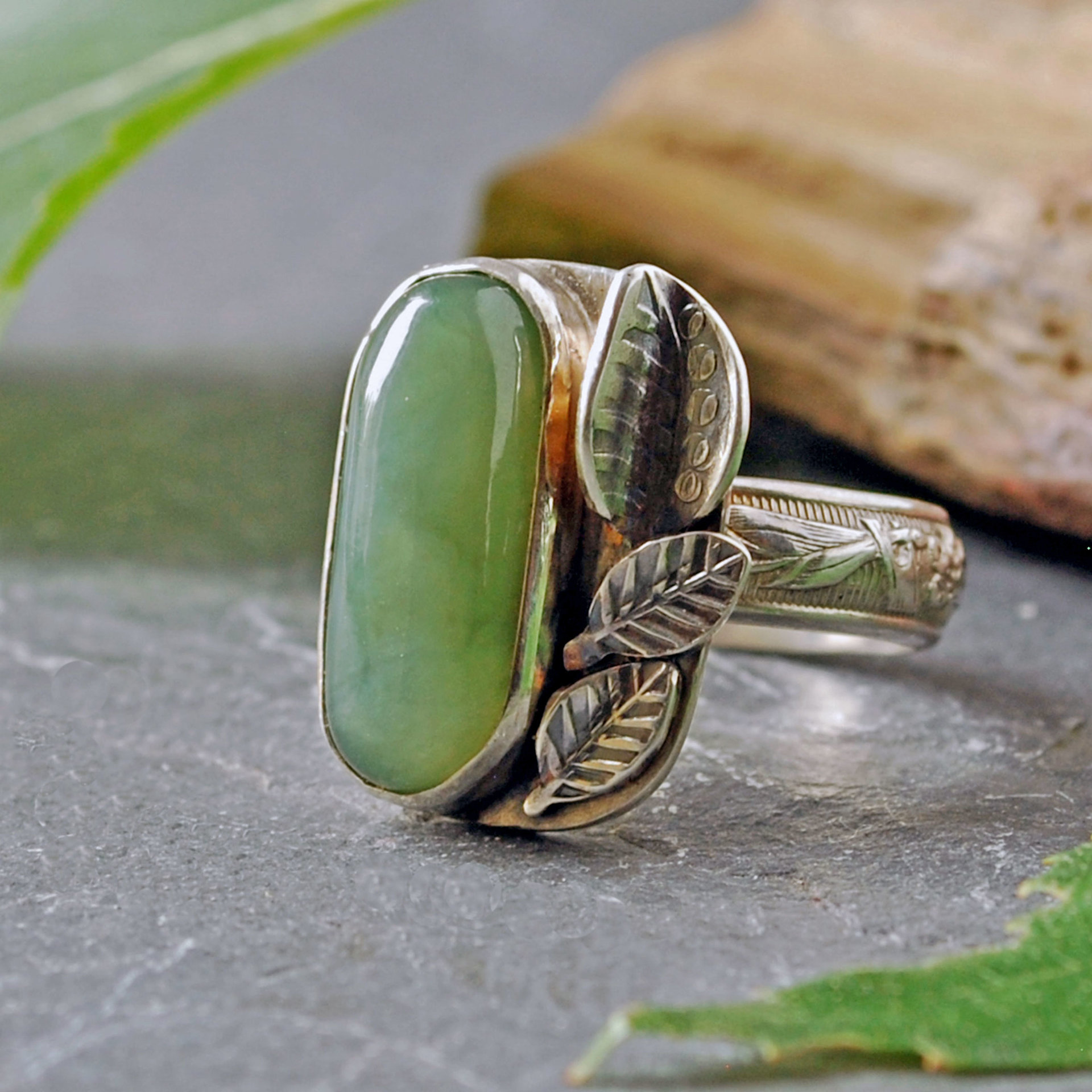 This nature inspired ring features a mossy green Nephrite Jade cabochon. I decided that lovely soft green deserved to be nestled in leaves. I stamped the leaf patterns onto silver, sawed them out and added them next to the stone. The ring band is sterling silver pattern wire, with a lovely vine and flower pattern. The edges of the band have been rounded and smoothed for comfortable wearing.