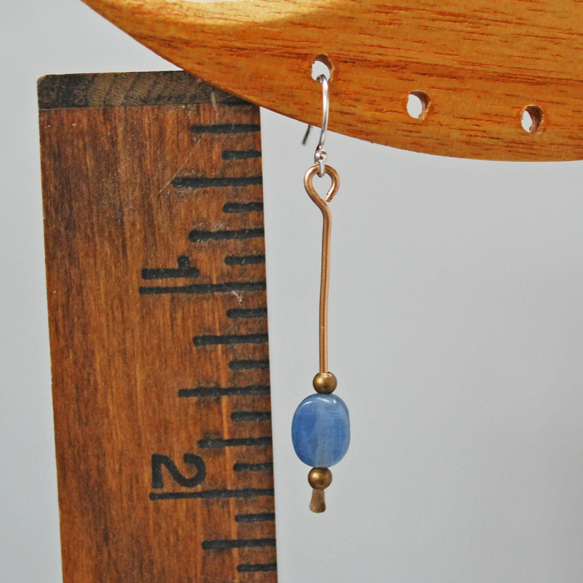 There is something exotic about the combination of kyanite and bronze that I just love. These are simple drop earrings that can be as elegant as you'd like to be but can also look great with a pair of jeans. They are made of bronze wire, which as been hammered flat at the bottom to hold the beads. I added a bronze spacer bead on both sides of the flat oval kyanite bead. The ear wires are sterling silver.