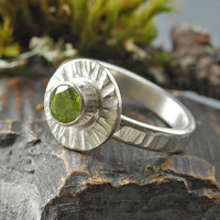 This dainty size 6 1/2 ring glitters with the promise of summer. Made of sterling silver, the setting is a round disk that I hammered to look almost like sun rays around the faceted yellow-green peridot set in the middle. I also hammered the band to match the setting.