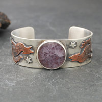 A full purple fluorite moon brings out the singing coyotes - or wolves, depending on your preference. There are two copper coyotes on either side of the fluorite moon, surrounded by fine silver stars. The cuff is made of 16 gauge (about 1.5mm) sterling silver, which has been antiqued and then polished, leaving the silver around the coyotes and stars dark for contrast. The cabochon is set in a fine silver bezel on a sterling silver back.